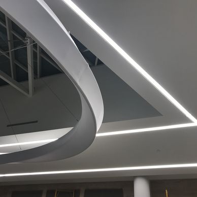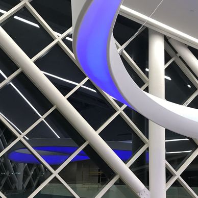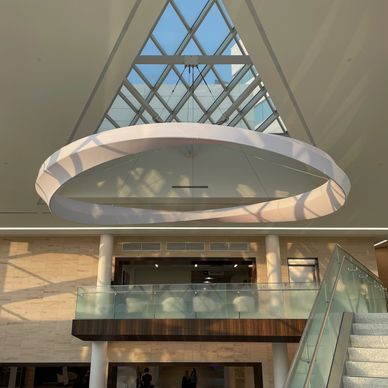 Halo achieves its ethereal quality through a lightweight tensile fabric stretched over a sleek aluminum frame, creating a luminous centerpiece that captivates the eye. Integrated LEDs imbue the artwork with infinite color possibilities, allowing it to adapt to any occasion or event. This versatility makes Halo a vital element in enriching the experience of staff, patients, and guests within the medical center.