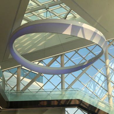Gabriel drew inspiration from the rich history of the medical campus and its balanced evolution. This narrative is embodied in the structural steel cables and support brace that suspend Halo from the lobby’s ceiling, introducing intrigue and dynamism to the composition. As a universal symbol of hope, the circular form of Halo embraces the pure, timeless qualities of a circle— infinite, unyielding, and ethereal. This geometric simplicity resonates with the human spirit, offering a sense of upliftment and serenity.